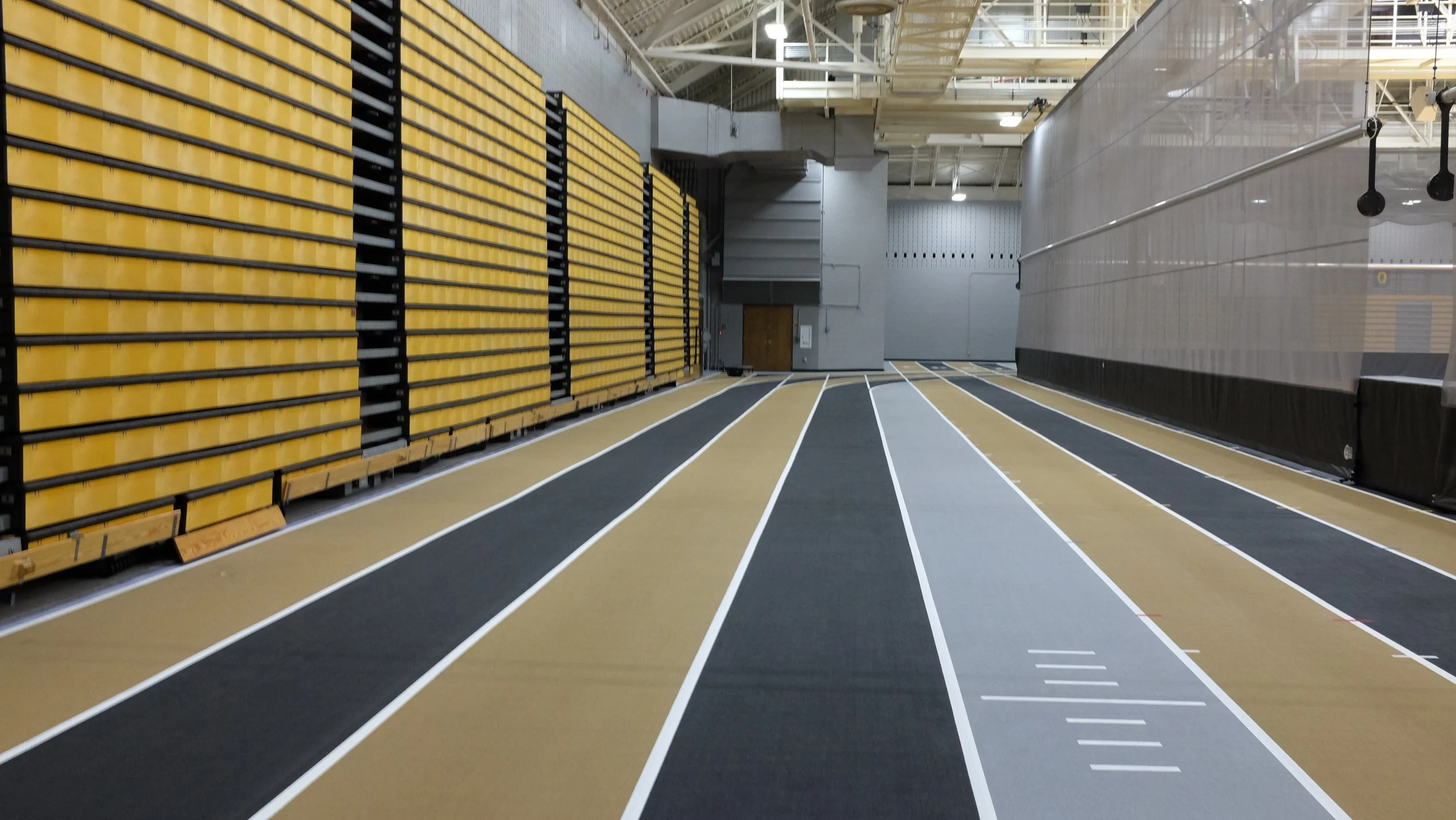 This unique project replaced the existing sprung resilient running track at the Klotsche Center Field House at the University of Wisconsin-Milwaukee. The Field House facilities include a wood strip center basketball court with a surrounding resilient running track, both of which share a sprung substrate. Removal of the existing track was detailed in a manner that left the sprung substrate under the wood court intact and undisturbed. Construction of the new sprung substrate for the track replacement was fully and continuously integrated into the remaining wood court substrate, with the new track surface installed flush with the existing wood court. The new track surface is ASBA Class 3 Certified to be in conformance with NCAA Rule 1 Standards and in conformance with IAAF Track Facilities Requirements. Adjacent practice courts, field event facilities, and associated equipment and standards were also replaced, along with refinishing of the wood floor and the entire space, giving the 40 year old field house a bright, updated appearance utilizing the current School colors and graphics scheme.
